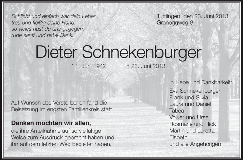 Hier finden Sie alle Traueranzeigen aus der Zeitung, die bisher für Dieter Schnekenburger erschienen sind. Weitere Traueranzeigen, die in der Zeitung erscheinen, werden hier ebenfalls aufgelistet