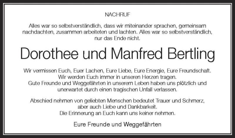 Hier finden Sie alle Traueranzeigen aus der Zeitung, die bisher für Dorothee Bertling erschienen sind. Weitere Traueranzeigen, die in der Zeitung erscheinen, werden hier ebenfalls aufgelistet