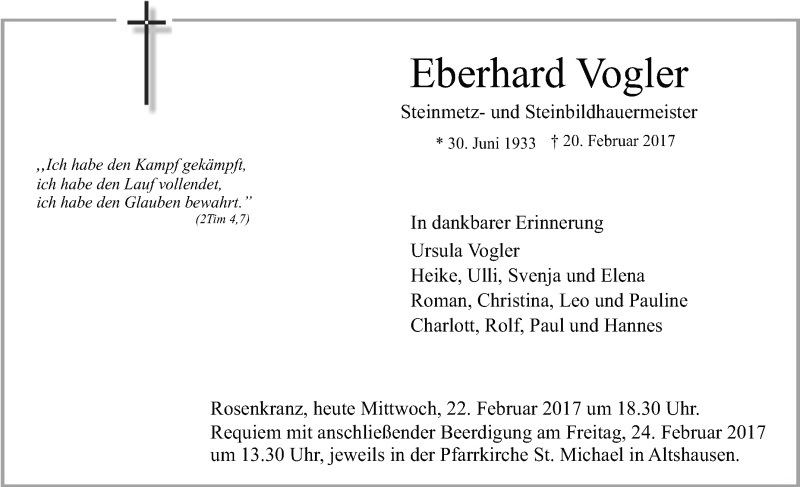 Hier finden Sie alle Traueranzeigen aus der Zeitung, die bisher für Eberhard Vogler erschienen sind. Weitere Traueranzeigen, die in der Zeitung erscheinen, werden hier ebenfalls aufgelistet