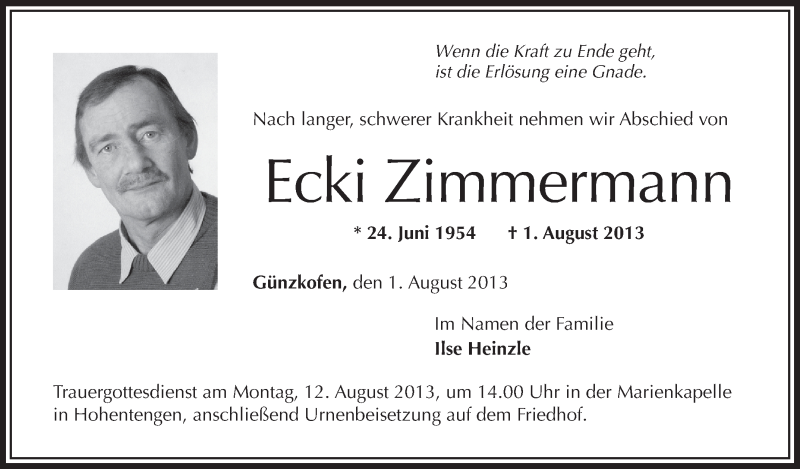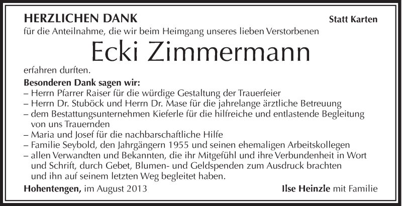 Hier finden Sie alle Traueranzeigen aus der Zeitung, die bisher für Ecki Zimmermann erschienen sind. Weitere Traueranzeigen, die in der Zeitung erscheinen, werden hier ebenfalls aufgelistet