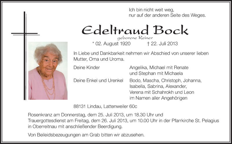 Hier finden Sie alle Traueranzeigen aus der Zeitung, die bisher für Edeltraud Bock erschienen sind. Weitere Traueranzeigen, die in der Zeitung erscheinen, werden hier ebenfalls aufgelistet