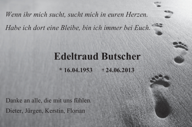 Hier finden Sie alle Traueranzeigen aus der Zeitung, die bisher für Edeltraud Butscher erschienen sind. Weitere Traueranzeigen, die in der Zeitung erscheinen, werden hier ebenfalls aufgelistet