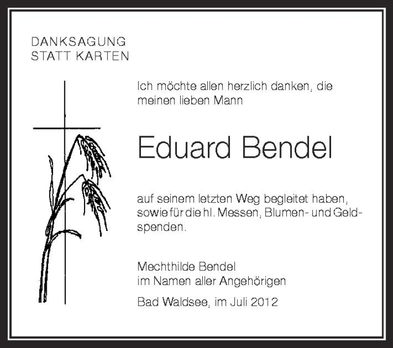 Hier finden Sie alle Traueranzeigen aus der Zeitung, die bisher für Eduard Bendel erschienen sind. Weitere Traueranzeigen, die in der Zeitung erscheinen, werden hier ebenfalls aufgelistet