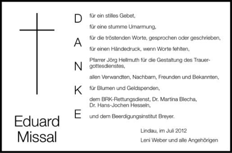 Hier finden Sie alle Traueranzeigen aus der Zeitung, die bisher für Eduard Missal erschienen sind. Weitere Traueranzeigen, die in der Zeitung erscheinen, werden hier ebenfalls aufgelistet