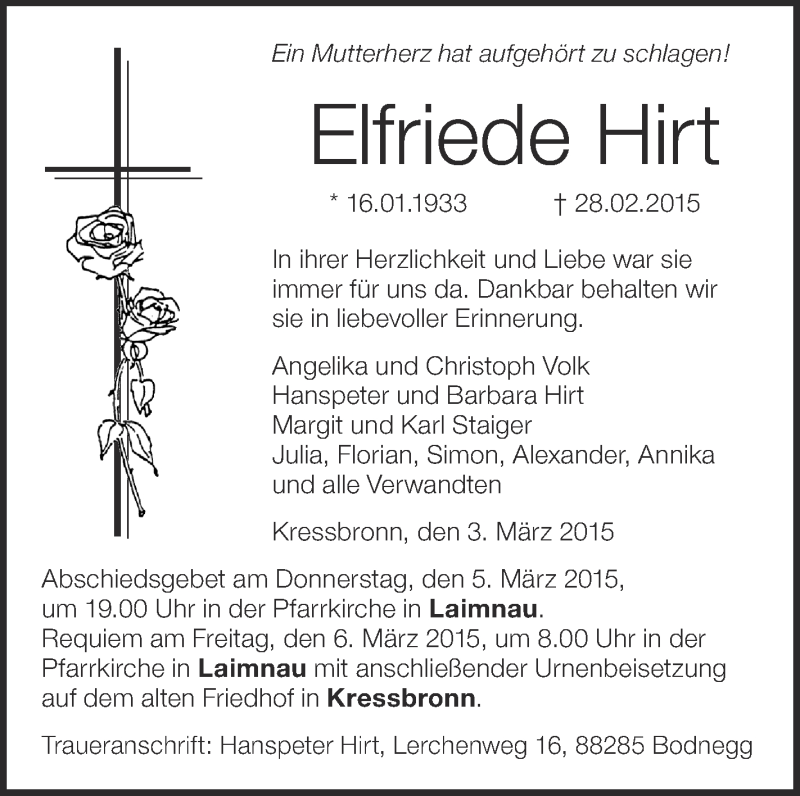 Hier finden Sie alle Traueranzeigen aus der Zeitung, die bisher für Elfriede Hirt erschienen sind. Weitere Traueranzeigen, die in der Zeitung erscheinen, werden hier ebenfalls aufgelistet