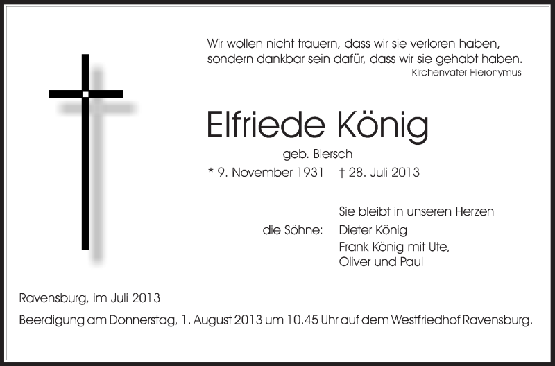 Hier finden Sie alle Traueranzeigen aus der Zeitung, die bisher für Elfriede König erschienen sind. Weitere Traueranzeigen, die in der Zeitung erscheinen, werden hier ebenfalls aufgelistet