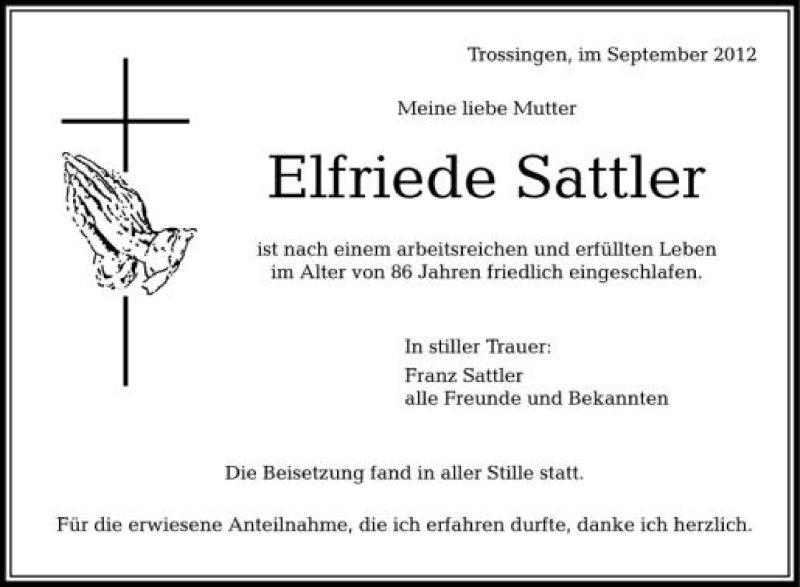 Hier finden Sie alle Traueranzeigen aus der Zeitung, die bisher für Elfriede Sattler erschienen sind. Weitere Traueranzeigen, die in der Zeitung erscheinen, werden hier ebenfalls aufgelistet