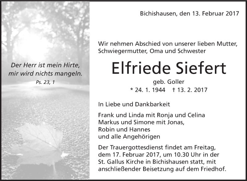 Hier finden Sie alle Traueranzeigen aus der Zeitung, die bisher für Elfriede Siefert erschienen sind. Weitere Traueranzeigen, die in der Zeitung erscheinen, werden hier ebenfalls aufgelistet