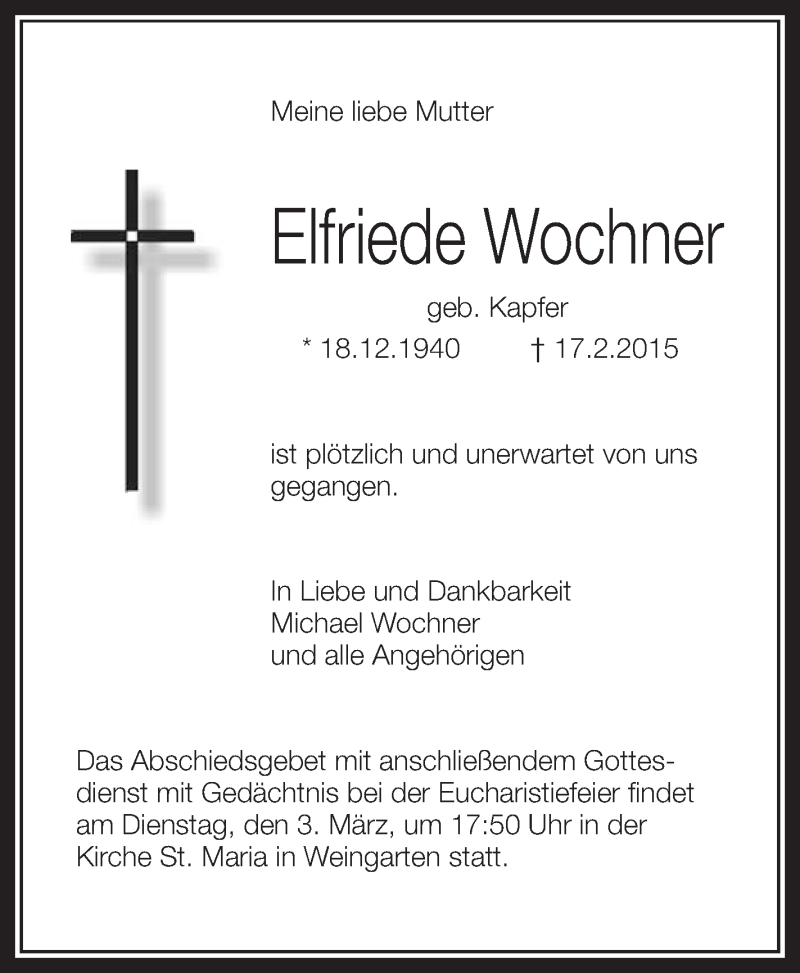 Hier finden Sie alle Traueranzeigen aus der Zeitung, die bisher für Elfriede Wochner erschienen sind. Weitere Traueranzeigen, die in der Zeitung erscheinen, werden hier ebenfalls aufgelistet