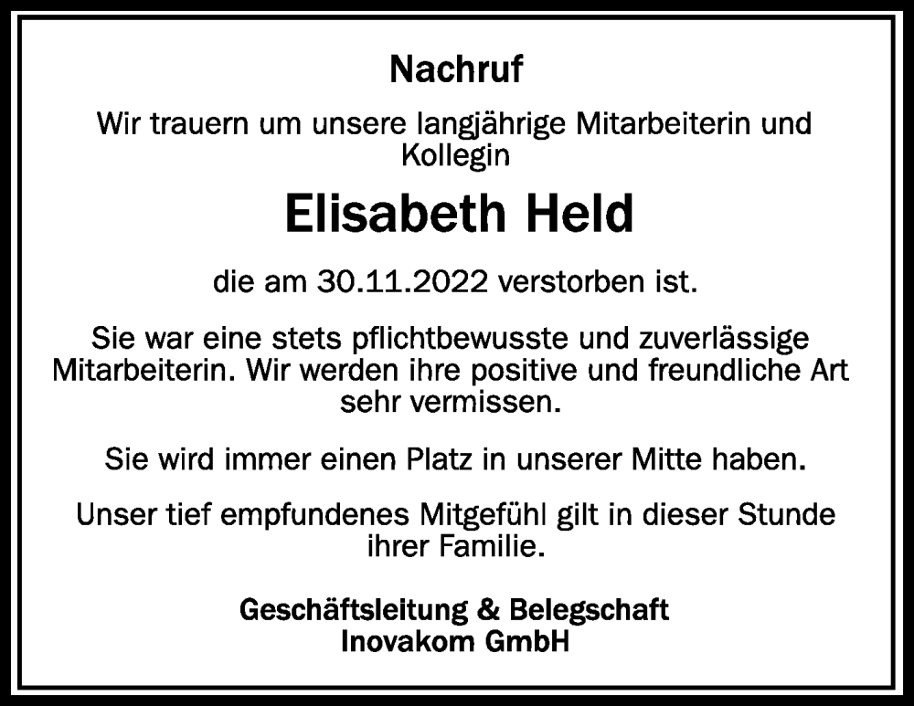 Hier finden Sie alle Traueranzeigen aus der Zeitung, die bisher für Elisabeth Held erschienen sind. Weitere Traueranzeigen, die in der Zeitung erscheinen, werden hier ebenfalls aufgelistet