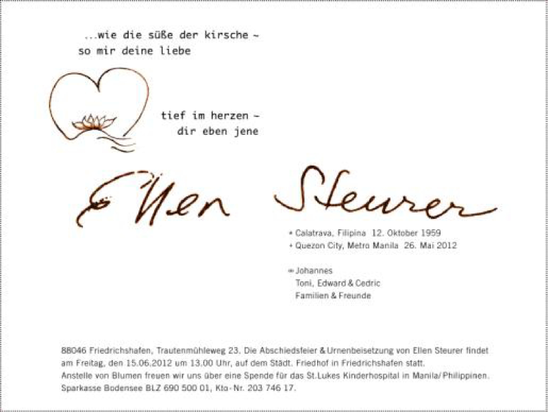 Hier finden Sie alle Traueranzeigen aus der Zeitung, die bisher für Ellen Steurer erschienen sind. Weitere Traueranzeigen, die in der Zeitung erscheinen, werden hier ebenfalls aufgelistet