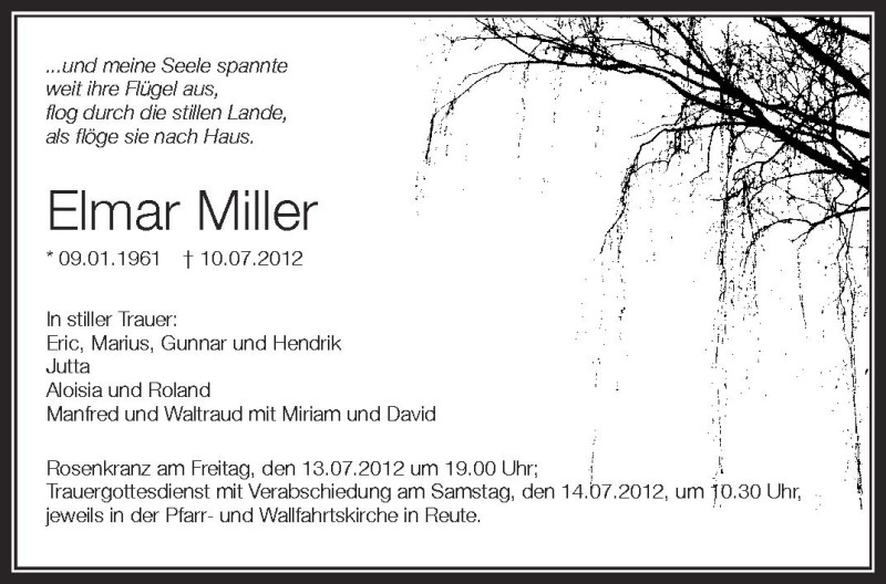 Hier finden Sie alle Traueranzeigen aus der Zeitung, die bisher für Elmar Miller erschienen sind. Weitere Traueranzeigen, die in der Zeitung erscheinen, werden hier ebenfalls aufgelistet