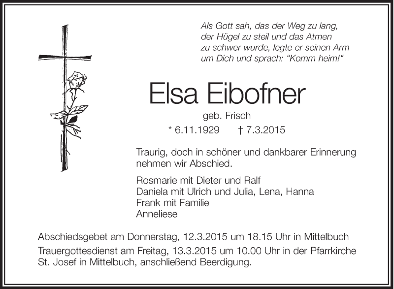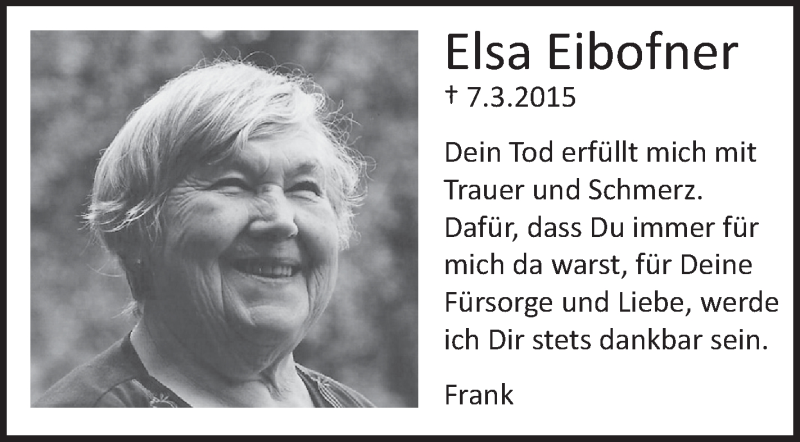 Hier finden Sie alle Traueranzeigen aus der Zeitung, die bisher für Elsa Eibofner erschienen sind. Weitere Traueranzeigen, die in der Zeitung erscheinen, werden hier ebenfalls aufgelistet