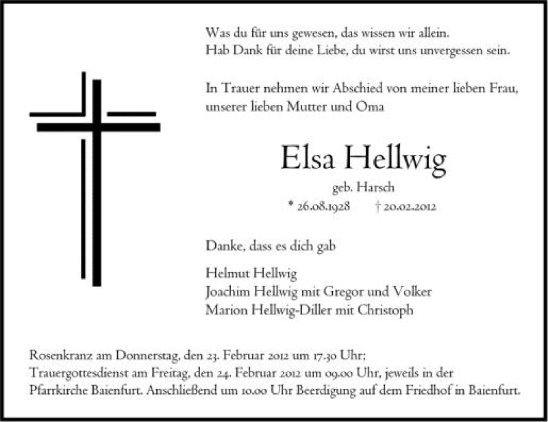 Hier finden Sie alle Traueranzeigen aus der Zeitung, die bisher für Elsa Hellwig erschienen sind. Weitere Traueranzeigen, die in der Zeitung erscheinen, werden hier ebenfalls aufgelistet