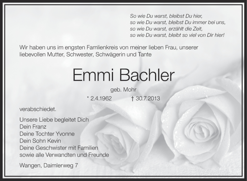Hier finden Sie alle Traueranzeigen aus der Zeitung, die bisher für Emmi Bachler erschienen sind. Weitere Traueranzeigen, die in der Zeitung erscheinen, werden hier ebenfalls aufgelistet