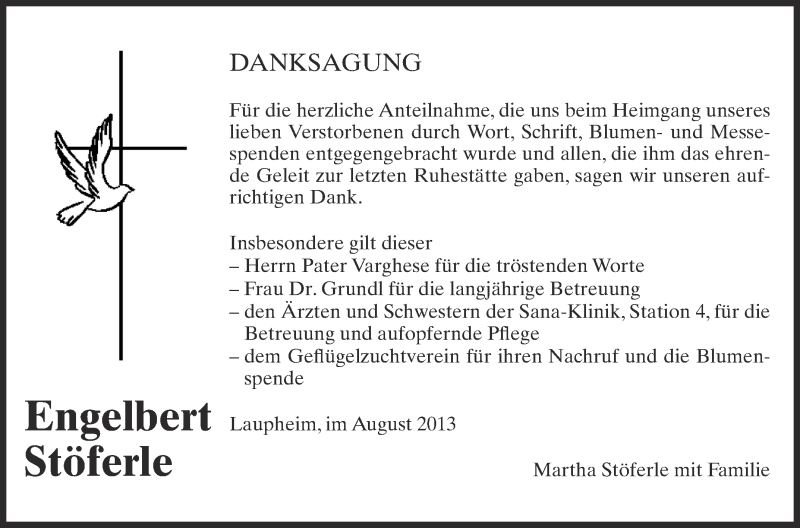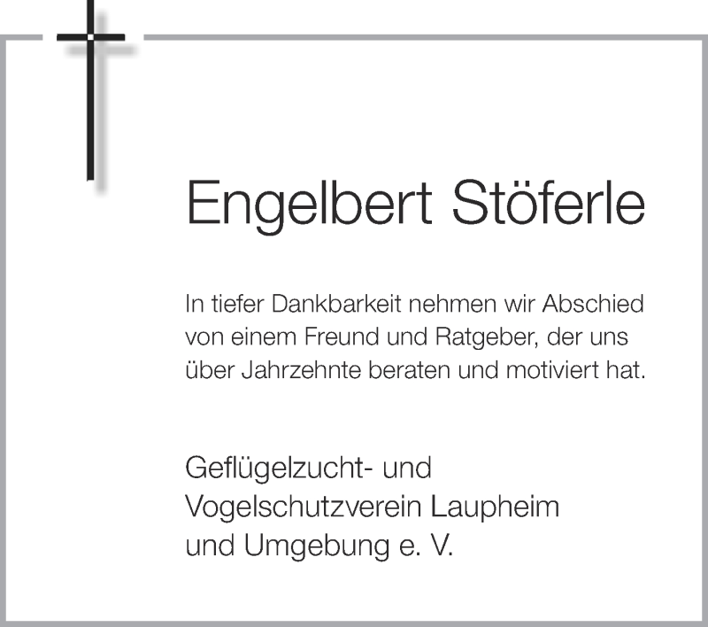 Hier finden Sie alle Traueranzeigen aus der Zeitung, die bisher für Engelbert Stöferle erschienen sind. Weitere Traueranzeigen, die in der Zeitung erscheinen, werden hier ebenfalls aufgelistet