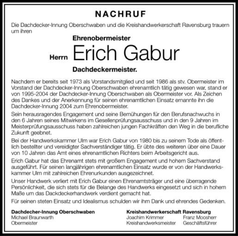 Hier finden Sie alle Traueranzeigen aus der Zeitung, die bisher für Erich Gabur erschienen sind. Weitere Traueranzeigen, die in der Zeitung erscheinen, werden hier ebenfalls aufgelistet