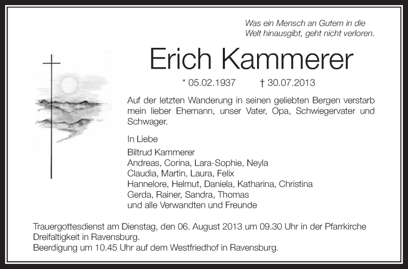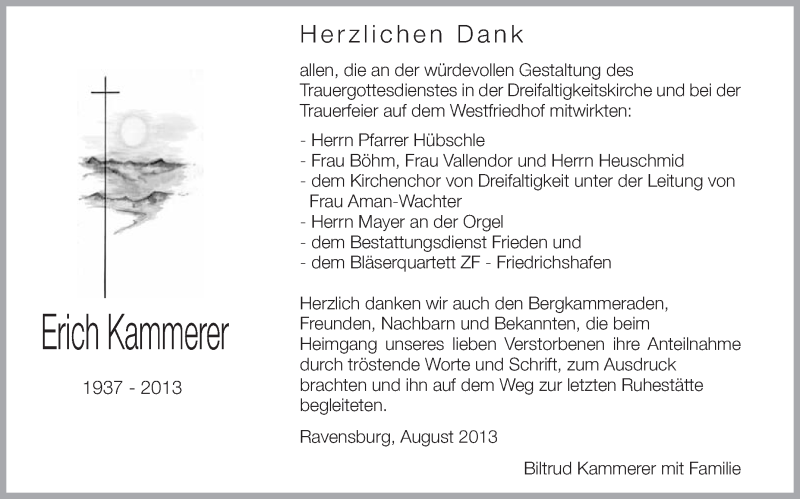Hier finden Sie alle Traueranzeigen aus der Zeitung, die bisher für Erich Kammerer erschienen sind. Weitere Traueranzeigen, die in der Zeitung erscheinen, werden hier ebenfalls aufgelistet