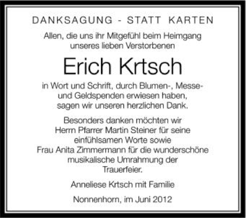 Hier finden Sie alle Traueranzeigen aus der Zeitung, die bisher für Erich Krtsch erschienen sind. Weitere Traueranzeigen, die in der Zeitung erscheinen, werden hier ebenfalls aufgelistet