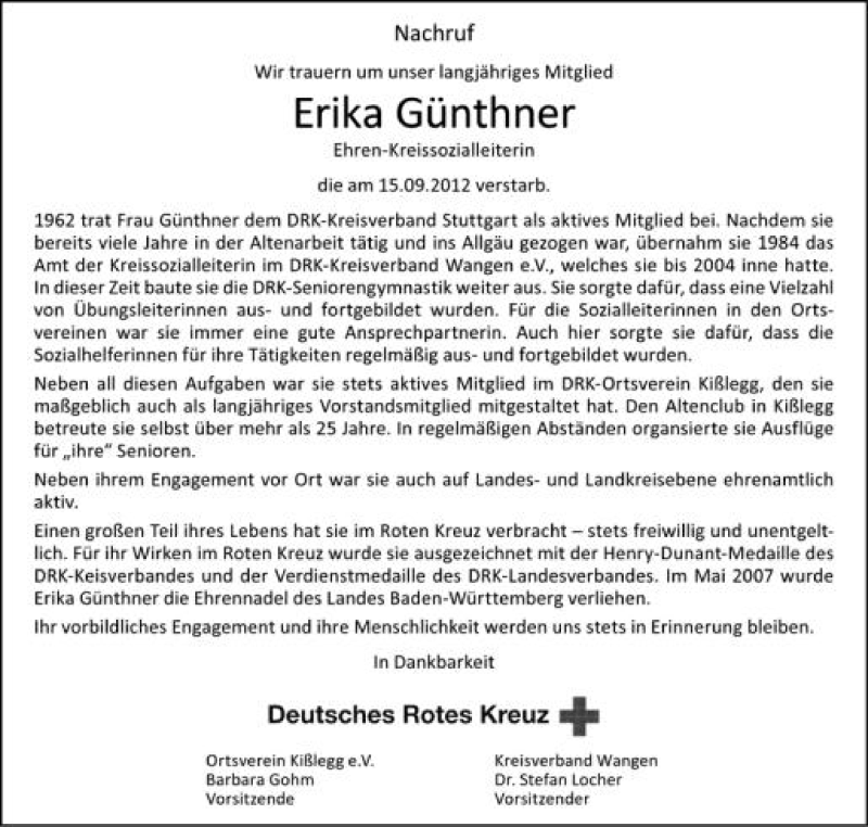 Hier finden Sie alle Traueranzeigen aus der Zeitung, die bisher für Erika Günthner erschienen sind. Weitere Traueranzeigen, die in der Zeitung erscheinen, werden hier ebenfalls aufgelistet