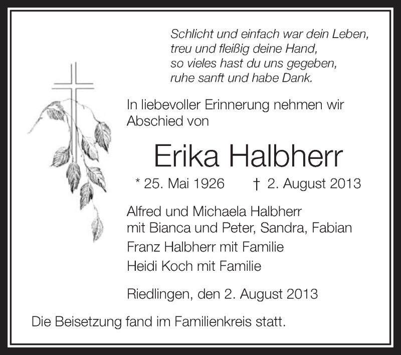 Hier finden Sie alle Traueranzeigen aus der Zeitung, die bisher für Erika Halbherr erschienen sind. Weitere Traueranzeigen, die in der Zeitung erscheinen, werden hier ebenfalls aufgelistet