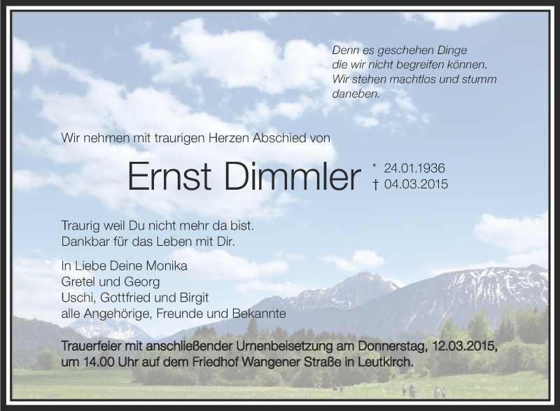 Hier finden Sie alle Traueranzeigen aus der Zeitung, die bisher für Ernst Dimmler erschienen sind. Weitere Traueranzeigen, die in der Zeitung erscheinen, werden hier ebenfalls aufgelistet