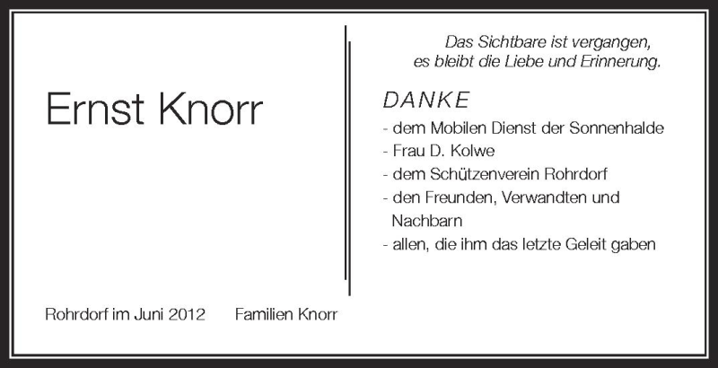 Hier finden Sie alle Traueranzeigen aus der Zeitung, die bisher für Ernst Knorr erschienen sind. Weitere Traueranzeigen, die in der Zeitung erscheinen, werden hier ebenfalls aufgelistet