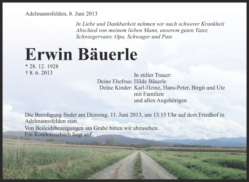 Hier finden Sie alle Traueranzeigen aus der Zeitung, die bisher für Erwin Bäuerle erschienen sind. Weitere Traueranzeigen, die in der Zeitung erscheinen, werden hier ebenfalls aufgelistet