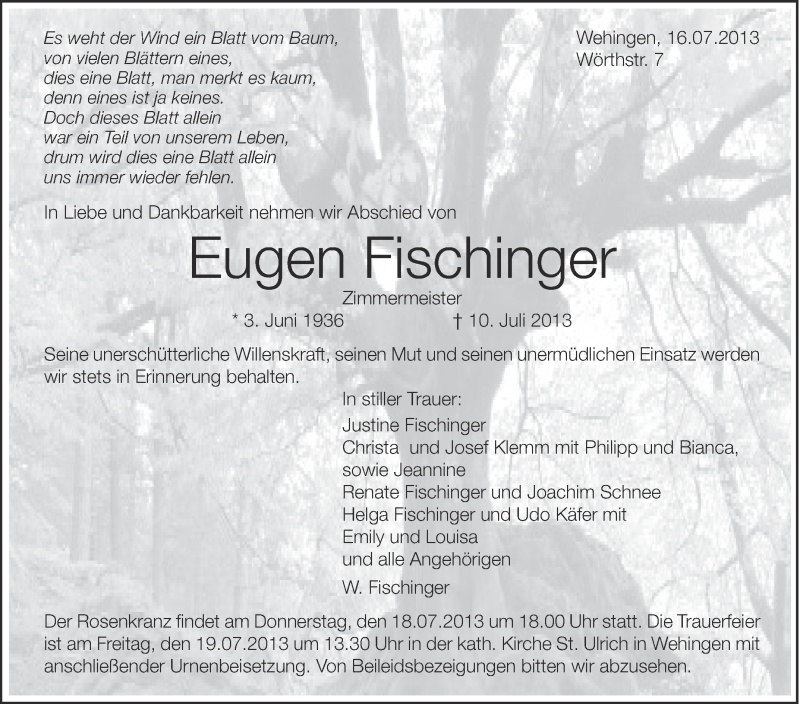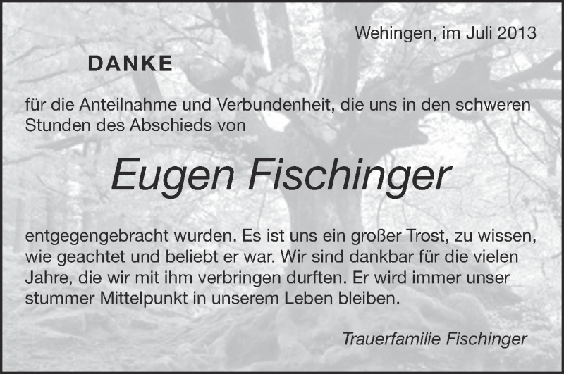 Hier finden Sie alle Traueranzeigen aus der Zeitung, die bisher für Eugen Fischinger erschienen sind. Weitere Traueranzeigen, die in der Zeitung erscheinen, werden hier ebenfalls aufgelistet