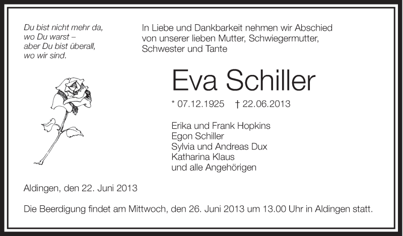 Hier finden Sie alle Traueranzeigen aus der Zeitung, die bisher für Eva Schiller erschienen sind. Weitere Traueranzeigen, die in der Zeitung erscheinen, werden hier ebenfalls aufgelistet