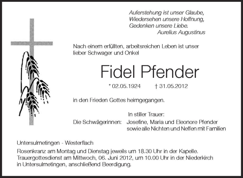 Hier finden Sie alle Traueranzeigen aus der Zeitung, die bisher für Fidel Pfender erschienen sind. Weitere Traueranzeigen, die in der Zeitung erscheinen, werden hier ebenfalls aufgelistet