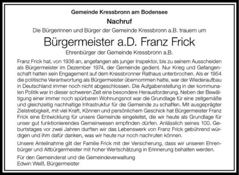 Hier finden Sie alle Traueranzeigen aus der Zeitung, die bisher für Franz Frick erschienen sind. Weitere Traueranzeigen, die in der Zeitung erscheinen, werden hier ebenfalls aufgelistet
