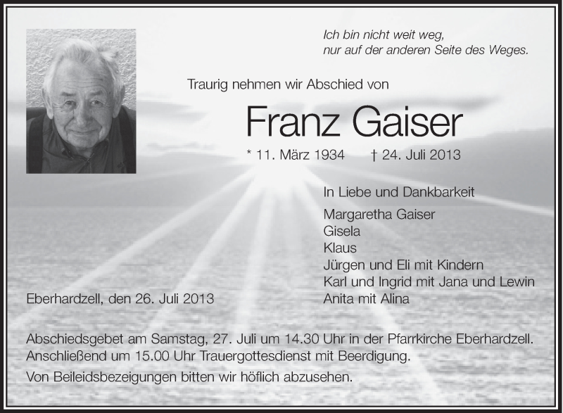 Hier finden Sie alle Traueranzeigen aus der Zeitung, die bisher für Franz Gaiser erschienen sind. Weitere Traueranzeigen, die in der Zeitung erscheinen, werden hier ebenfalls aufgelistet