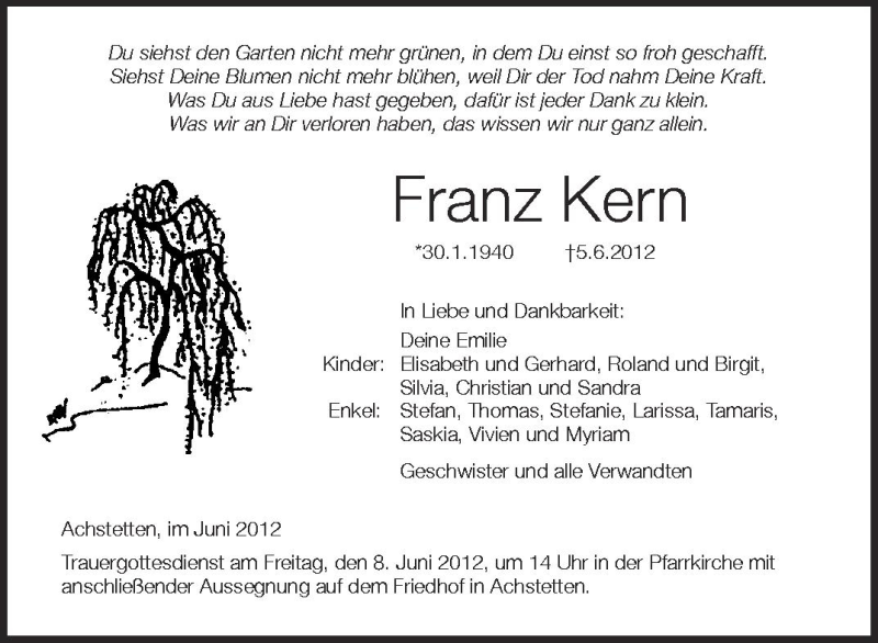 Hier finden Sie alle Traueranzeigen aus der Zeitung, die bisher für Franz Kern erschienen sind. Weitere Traueranzeigen, die in der Zeitung erscheinen, werden hier ebenfalls aufgelistet