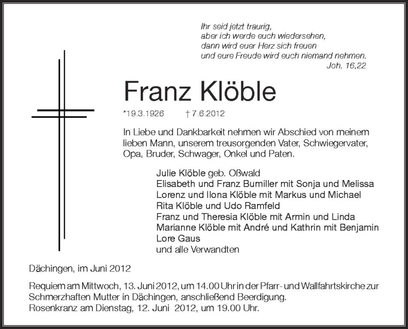 Hier finden Sie alle Traueranzeigen aus der Zeitung, die bisher für Franz Klöble erschienen sind. Weitere Traueranzeigen, die in der Zeitung erscheinen, werden hier ebenfalls aufgelistet
