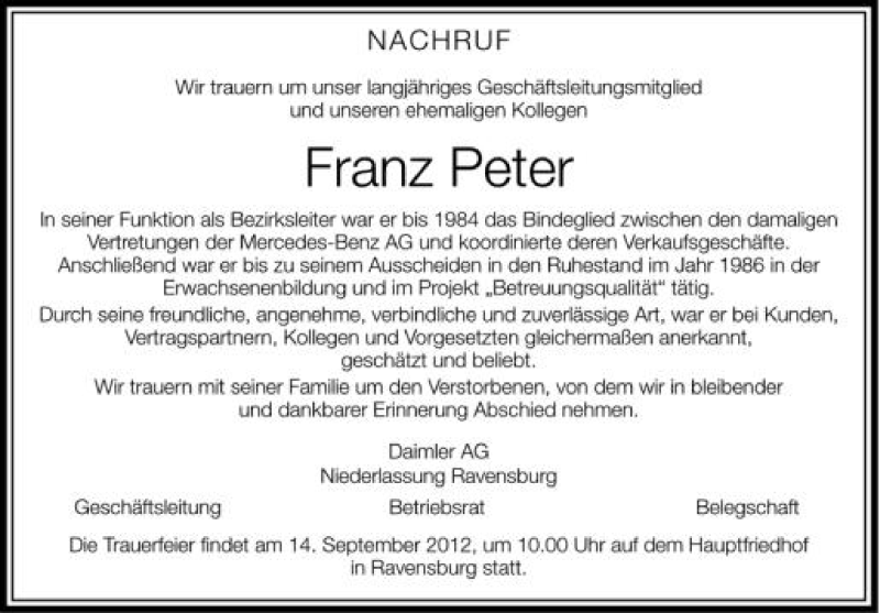 Hier finden Sie alle Traueranzeigen aus der Zeitung, die bisher für Franz Peter erschienen sind. Weitere Traueranzeigen, die in der Zeitung erscheinen, werden hier ebenfalls aufgelistet