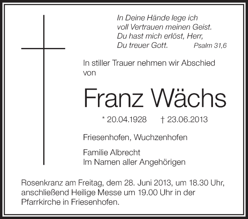 Hier finden Sie alle Traueranzeigen aus der Zeitung, die bisher für Franz Wächs erschienen sind. Weitere Traueranzeigen, die in der Zeitung erscheinen, werden hier ebenfalls aufgelistet