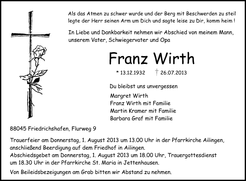 Hier finden Sie alle Traueranzeigen aus der Zeitung, die bisher für Franz Wirth erschienen sind. Weitere Traueranzeigen, die in der Zeitung erscheinen, werden hier ebenfalls aufgelistet