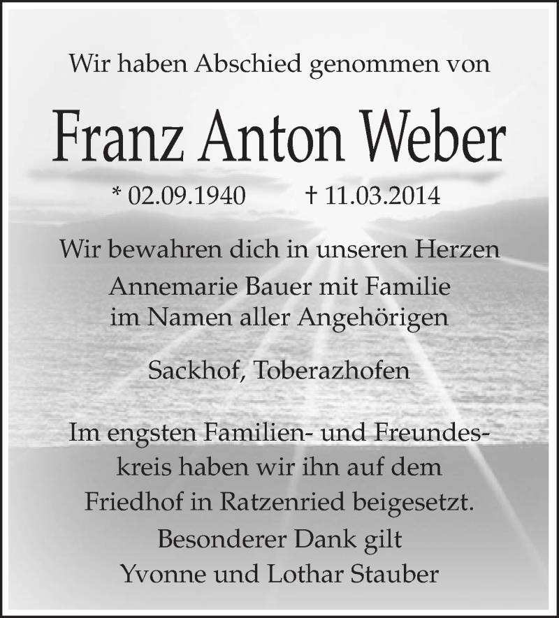 Hier finden Sie alle Traueranzeigen aus der Zeitung, die bisher für Franz Anton Weber erschienen sind. Weitere Traueranzeigen, die in der Zeitung erscheinen, werden hier ebenfalls aufgelistet