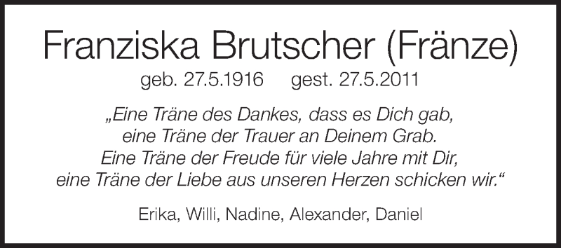 Hier finden Sie alle Traueranzeigen aus der Zeitung, die bisher für Franziska Brutscher erschienen sind. Weitere Traueranzeigen, die in der Zeitung erscheinen, werden hier ebenfalls aufgelistet