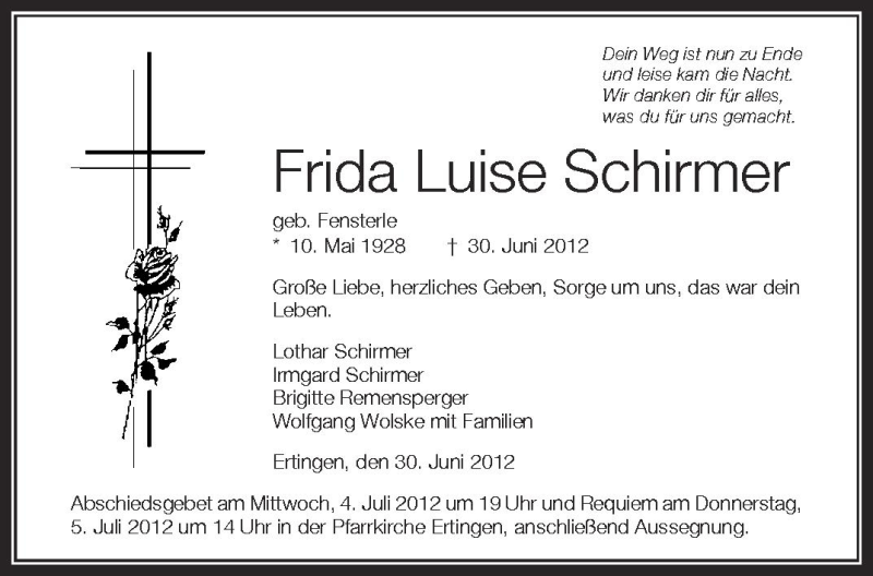 Hier finden Sie alle Traueranzeigen aus der Zeitung, die bisher für Frida Luise Schirmer erschienen sind. Weitere Traueranzeigen, die in der Zeitung erscheinen, werden hier ebenfalls aufgelistet