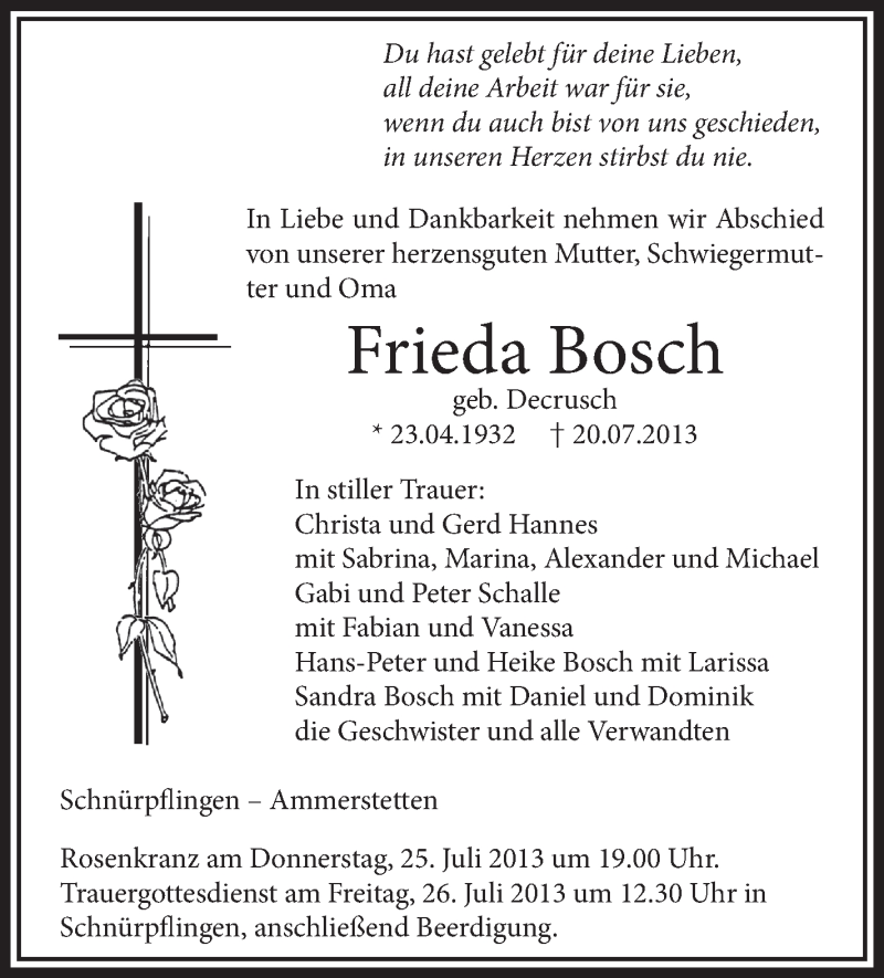 Hier finden Sie alle Traueranzeigen aus der Zeitung, die bisher für Frieda Bosch erschienen sind. Weitere Traueranzeigen, die in der Zeitung erscheinen, werden hier ebenfalls aufgelistet