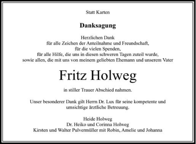 Hier finden Sie alle Traueranzeigen aus der Zeitung, die bisher für Fritz Holweg erschienen sind. Weitere Traueranzeigen, die in der Zeitung erscheinen, werden hier ebenfalls aufgelistet