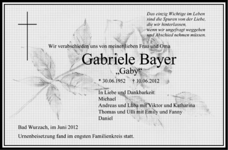 Hier finden Sie alle Traueranzeigen aus der Zeitung, die bisher für Gabriele Bayer erschienen sind. Weitere Traueranzeigen, die in der Zeitung erscheinen, werden hier ebenfalls aufgelistet