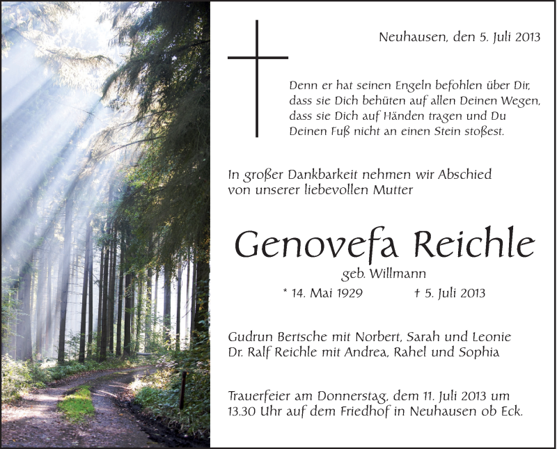 Hier finden Sie alle Traueranzeigen aus der Zeitung, die bisher für Genovefa Reichle erschienen sind. Weitere Traueranzeigen, die in der Zeitung erscheinen, werden hier ebenfalls aufgelistet
