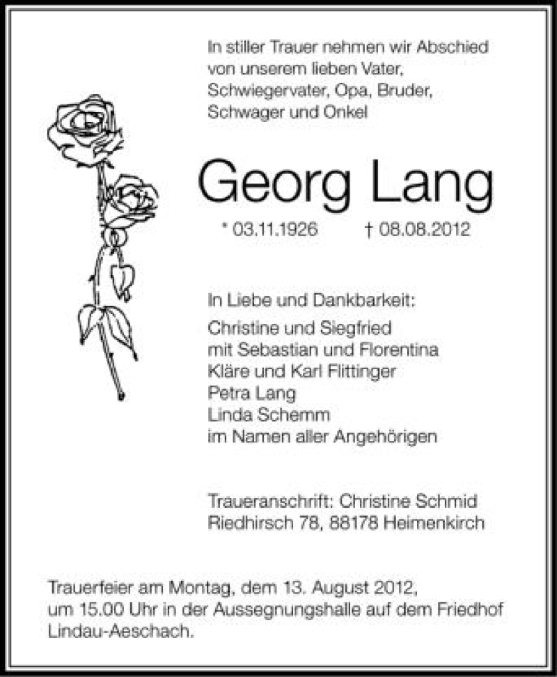 Hier finden Sie alle Traueranzeigen aus der Zeitung, die bisher für Georg Lang erschienen sind. Weitere Traueranzeigen, die in der Zeitung erscheinen, werden hier ebenfalls aufgelistet