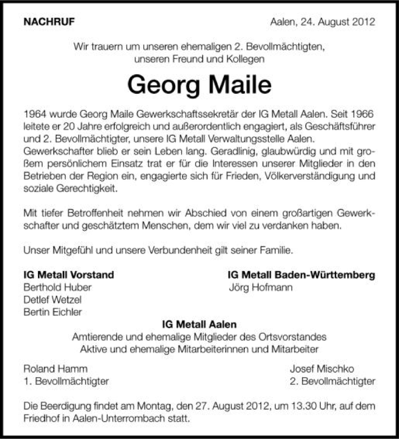 Hier finden Sie alle Traueranzeigen aus der Zeitung, die bisher für Georg Maile erschienen sind. Weitere Traueranzeigen, die in der Zeitung erscheinen, werden hier ebenfalls aufgelistet