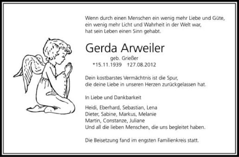 Hier finden Sie alle Traueranzeigen aus der Zeitung, die bisher für Gerda Arweiler erschienen sind. Weitere Traueranzeigen, die in der Zeitung erscheinen, werden hier ebenfalls aufgelistet