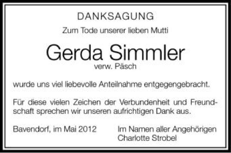 Hier finden Sie alle Traueranzeigen aus der Zeitung, die bisher für Gerda Simmler erschienen sind. Weitere Traueranzeigen, die in der Zeitung erscheinen, werden hier ebenfalls aufgelistet
