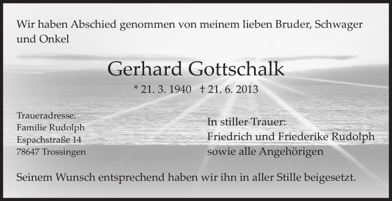 Hier finden Sie alle Traueranzeigen aus der Zeitung, die bisher für Gerhard Gottschalk erschienen sind. Weitere Traueranzeigen, die in der Zeitung erscheinen, werden hier ebenfalls aufgelistet
